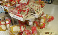 しばずきんをクリスマスツリーにしました!アクリル什器をつかって、しばずきんぽんぽんが縦に並んでいます。…